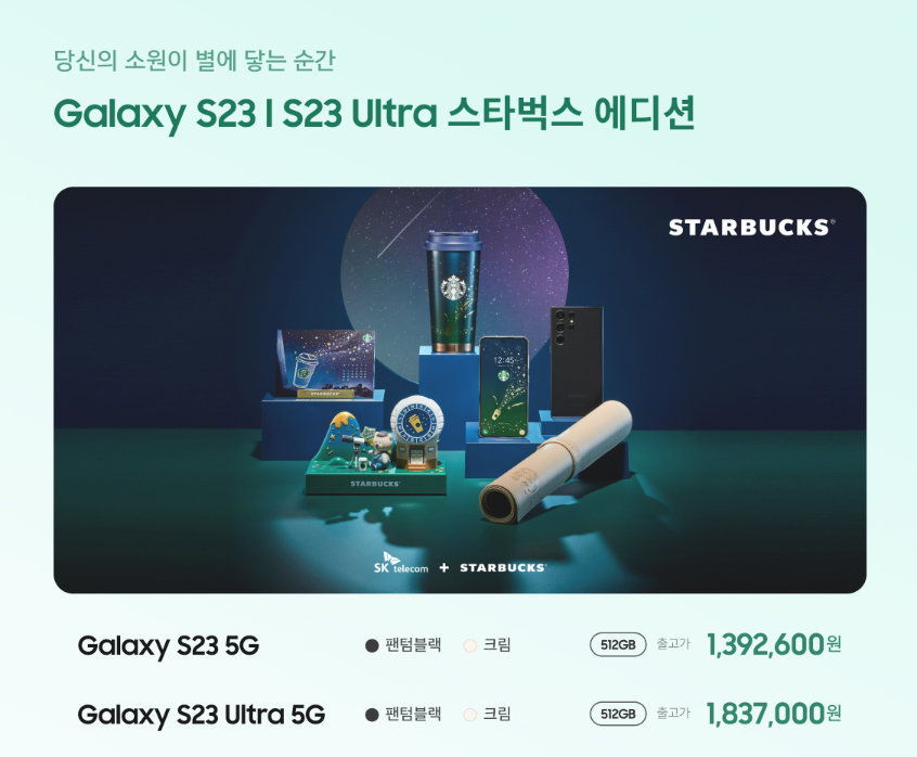 지난 17일부터 사전예약을 끝으로 정식으로 판매를 시작한 갤럭시 s23 / 갤럭시 s23+ / 갤럭시 s23울트라가 큰 화제를 불러일읔켰습니다. 작년 갤럭시 s22의 보안점을 강화해 출시한 s23시리즈의 카메라 성능과 기능과 디자인 아이폰을 능가하는 벤치마킹 속도 등 많은 사람들을 아이폰에서 갤럭시로 갈아타는 계기가 되었습니다. 오늘은 조금 특별한 것을 좋아하는 분들을 위한 skt t월드에서 4월 1일까지 기간 한정으로 판매하는 갤럭시 s23스타벅스 에디션에 대해 알려드리겠습니다. 저번 bmw에디션 완판을 이은 스타벅스 에디션도 4월 1일 전에 완판이 날것으로 보여집니다.