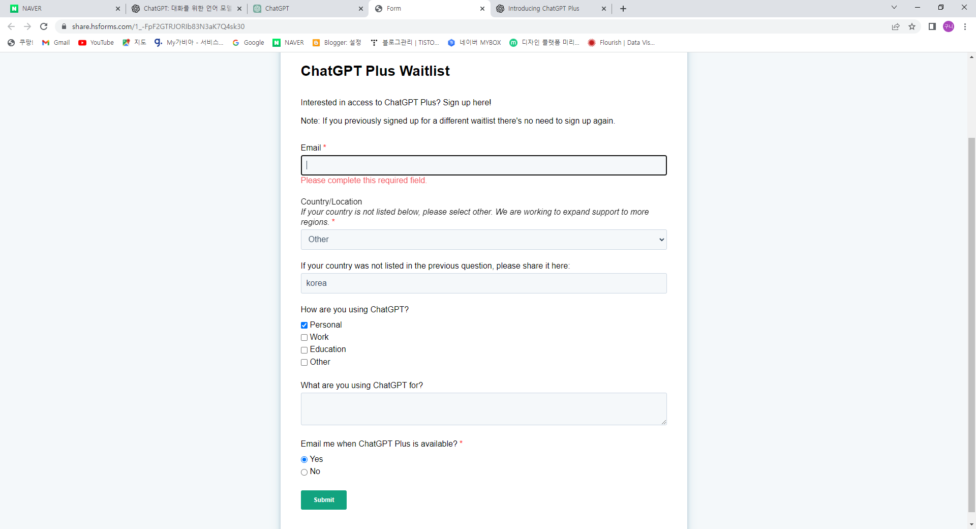 세 번째 란: other클릭 후 korea라고 따로 적어줍니다.