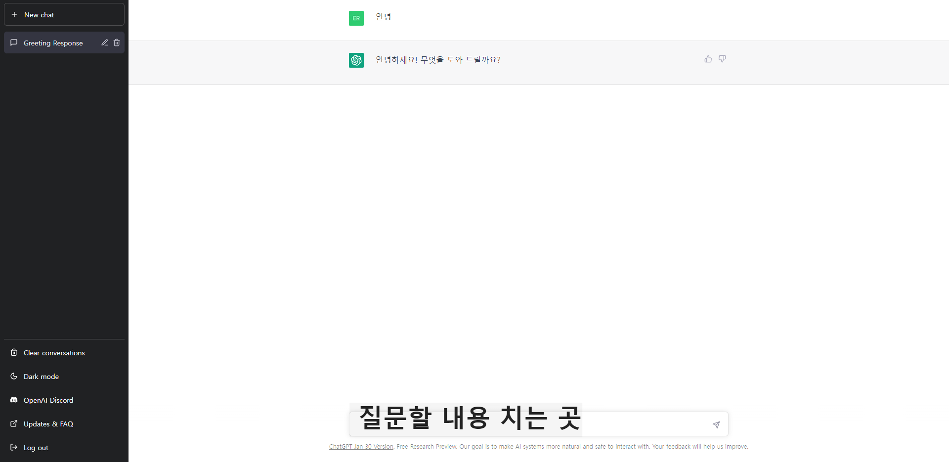 이러한 화면이 나옵니다. 모든 가입 절차가 끝났고 바로 이용하시면 됩니다. 어떻게 사용하는지 감을 못 잡는 분들을 위해 어디까지 chatgpt ai 채팅 로봇이 똑똑한지 예시를 보여드리겠습니다.