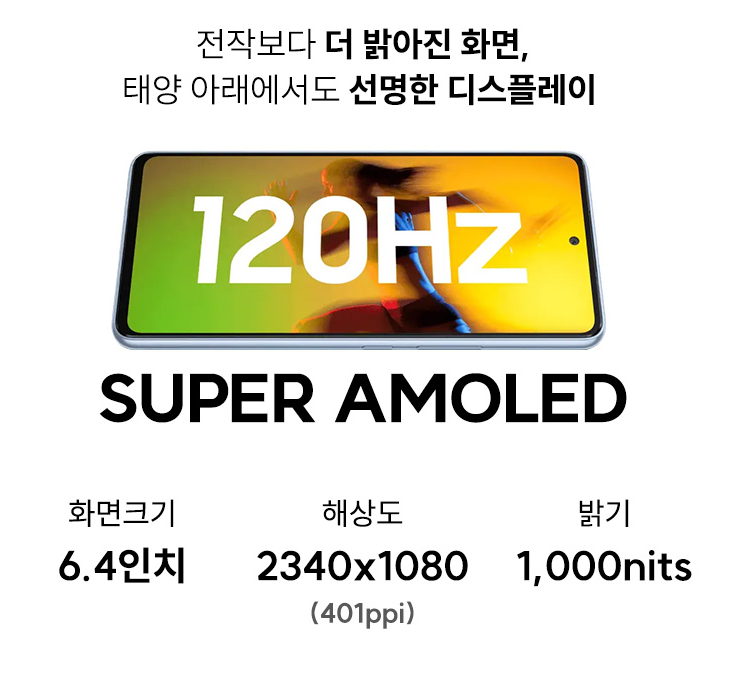 전 갤럭시 퀀텀 3 모델보다 6.4인치라는 조금 작아진 화면으로 출시가 되었습니다. 다만 전 시즌보다 베젤의 두께가 얇아져서 화면비가 더 꽉 찬 느낌을 줍니다. 다이아몬드 형태 RG-BG 펜타일 서브 픽셀 방식의 19;5;9 비율 2340 x 1080이 탑재가 되어 갤럭시 s23 못지않은 깔끔한 디스플레이를 선보였습니다.